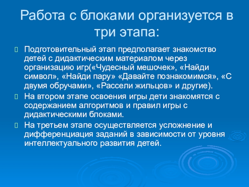 На втором этапе освоения игры дети знакомятся с содержанием алгоритмов и правил игры с дидактическими блоками.