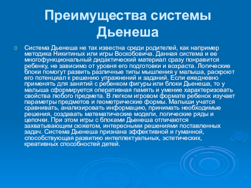 методика Никитиных или игры Воскобовича. Данная система и ее многофункциональный дидактический материал сразу понравится ребенку, не зависимо от уровня его подготовки и возраста. Логические блоки помогут развить различные типы мышления у малыша, раскроют его потенциал к решению упражнений и заданий. Если ежедневно применять для занятий с ребенком фигуры или блоки Дьенеша, то у малыша сформируется оперативная память и умение характеризовать свойства любого предмета. В легком игровом формате ребенок изучает параметры предметов и геометрические формы. Малыши учатся сравнивать, анализировать информацию, принимать необходимые решения, создавать математические модели, логические ряды и цепочки. При этом игры с блоками Дьенеша отличаются захватывающим сюжетом, интересными решениями поставленных задач. Система Дьенеша признана эффективной и гуманной, способствующая развитию интеллектуальных, эстетических, креативных способностей детей.