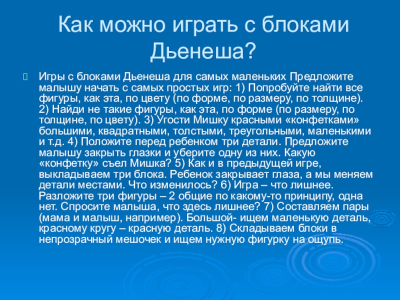 маленьких Предложите малышу начать с самых простых игр: 1) Попробуйте найти все фигуры, как эта, по цвету (по форме, по размеру, по толщине). 2) Найди не такие фигуры, как эта, по форме (по размеру, по толщине, по цвету). 3) Угости Мишку красными «конфетками» большими, квадратными, толстыми, треугольными, маленькими и т.д. 4) Положите перед ребенком три детали. Предложите малышу закрыть глазки и уберите одну из них. Какую «конфетку» съел Мишка? 5) Как и в предыдущей игре, выкладываем три блока. Ребенок закрывает глаза, а мы меняем детали местами. Что изменилось? 6) Игра – что лишнее. Разложите три фигуры – 2 общие по какому-то принципу, одна нет. Спросите малыша, что здесь лишнее? 7) Составляем пары (мама и малыш, например). Большой- ищем маленькую деталь, красному кругу – красную деталь. 8) Складываем блоки в непрозрачный мешочек и ищем нужную фигурку на ощупь.