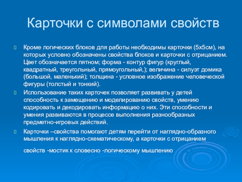 Карточки –свойства помогают детям перейти от наглядно-образного мышления к наглядно-схематическому, а карточки с отрицанием свойств -мостик к словесно -логическому мышлению