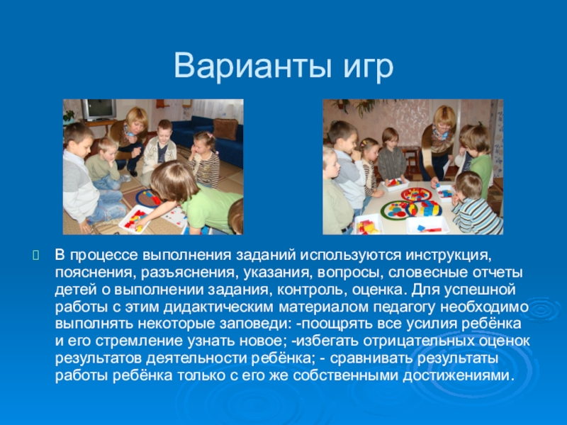 словесные отчеты детей о выполнении задания, контроль, оценка. Для успешной работы с этим дидактическим материалом педагогу необходимо выполнять некоторые заповеди: -поощрять все усилия ребёнка и его стремление узнать новое; -избегать отрицательных оценок результатов деятельности ребёнка; - сравнивать результаты работы ребёнка только с его же собственными достижениями.