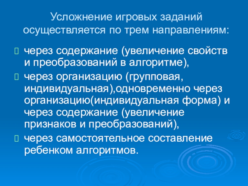 Слайд 10Усложнение игровых заданий осуществляется по трем направлениям: