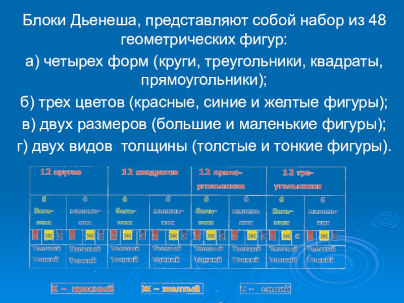 Слайд 7Блоки Дьенеша, представляют собой набор из 48 геометрических фигур: