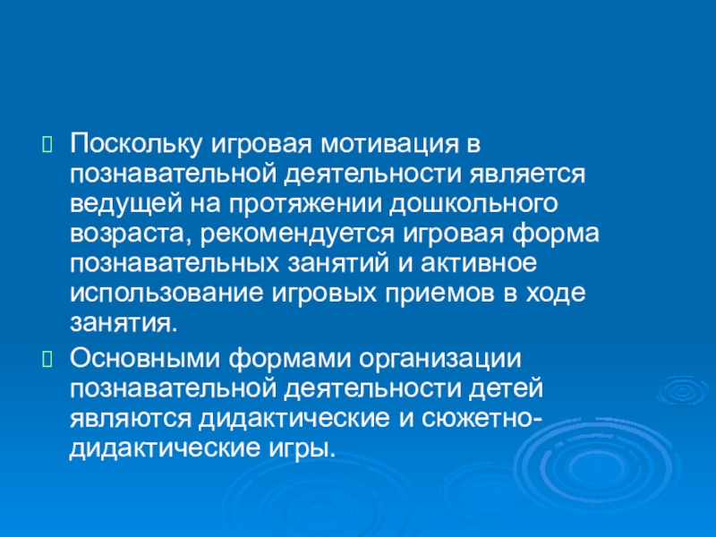 Поскольку игровая мотивация в познавательной деятельности является ведущей на протяжении дошкольного