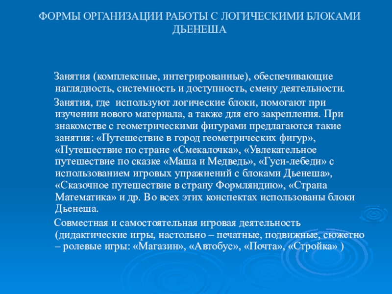 Слайд 11ФОРМЫ ОРГАНИЗАЦИИ РАБОТЫ С ЛОГИЧЕСКИМИ БЛОКАМИ ДЬЕНЕША
