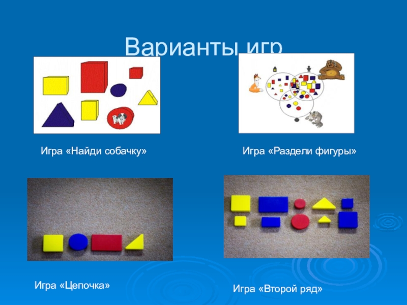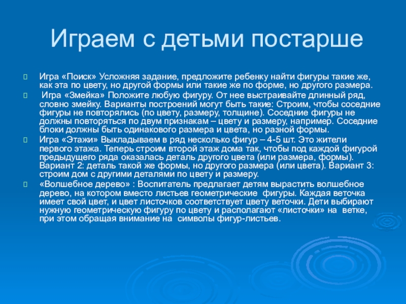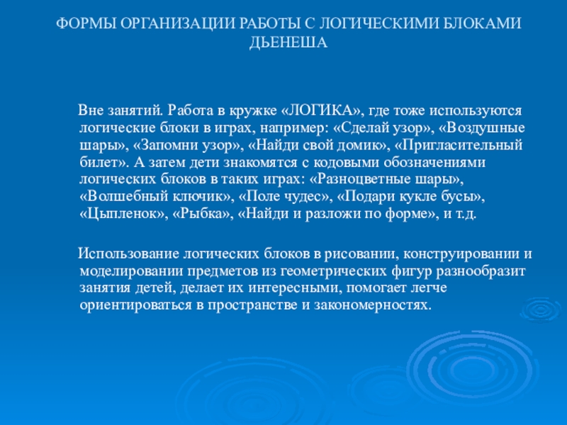 в кружке «ЛОГИКА», где тоже используются логические блоки в играх, например: «Сделай узор», «Воздушные шары», «Запомни узор», «Найди свой домик», «Пригласительный билет». А затем дети знакомятся с кодовыми обозначениями логических блоков в таких играх: «Разноцветные шары», «Волшебный ключик», «Поле чудес», «Подари кукле бусы», «Цыпленок», «Рыбка», «Найди и разложи по форме», и т.д.