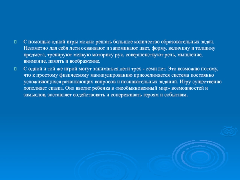 С одной и той же игрой могут заниматься дети трех - семи лет. Это возможно потому, что к простому физическому манипулированию присоединяется система постоянно усложняющихся развивающих вопросов и познавательных заданий. Игру существенно дополняет сказка. Она вводит ребенка в «необыкновенный мир» возможностей и замыслов, заставляет содействовать и сопереживать героям и событиям.