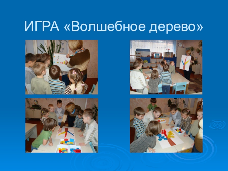 «Волшебное дерево» : Воспитатель предлагает детям вырастить волшебное дерево, на котором вместо листьев геометрические фигуры. Каждая веточка имеет свой цвет, и цвет листочков соответствует цвету веточки. Дети выбирают нужную геометрическую фигуру по цвету и располагают «листочки» на ветке, при этом обращая внимание на символы фигур-листьев.