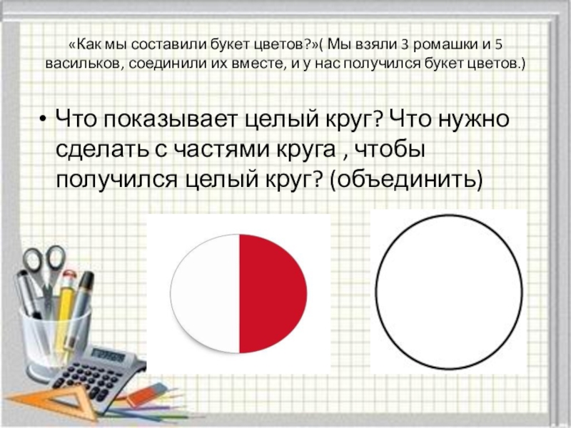 Что показывает целый круг? Что нужно сделать с частями круга , чтобы получился целый круг? (объединить)