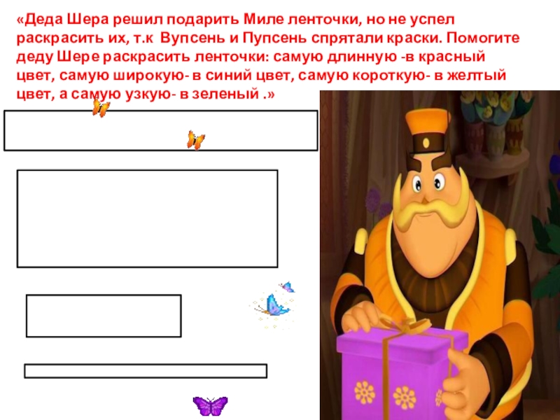Слайд 6«Деда Шера решил подарить Миле ленточки, но не успел раскрасить их,
