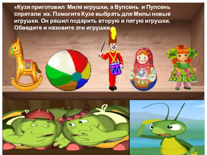 Слайд 5«Кузя приготовил Миле игрушки, а Вупсень и Пупсень спрятали их. Помогите