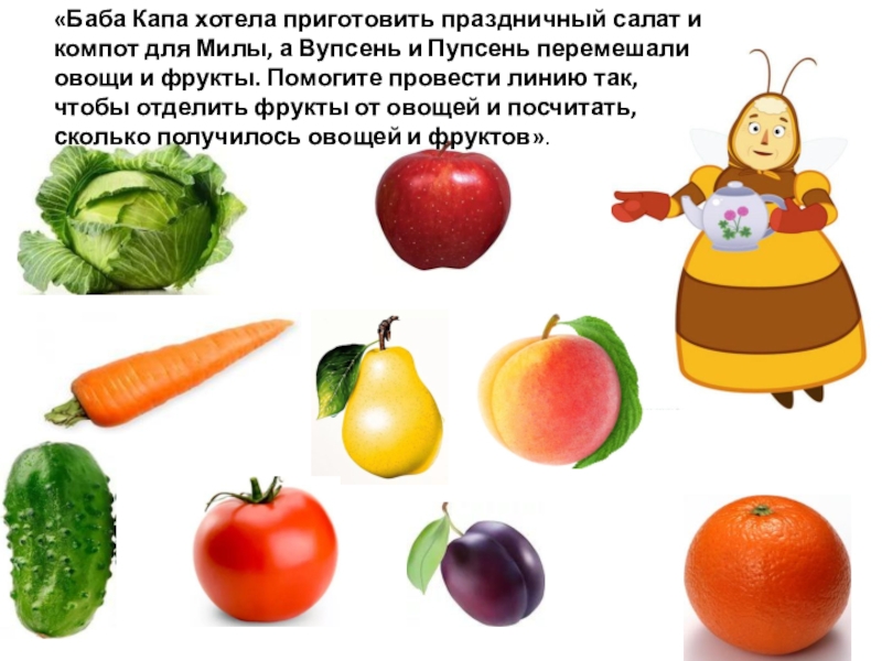 «Баба Капа хотела приготовить праздничный салат и компот для Милы, а Вупсень и Пупсень перемешали овощи и фрукты. Помогите провести линию так, чтобы отделить фрукты от овощей и посчитать, сколько получилось овощей и фруктов».