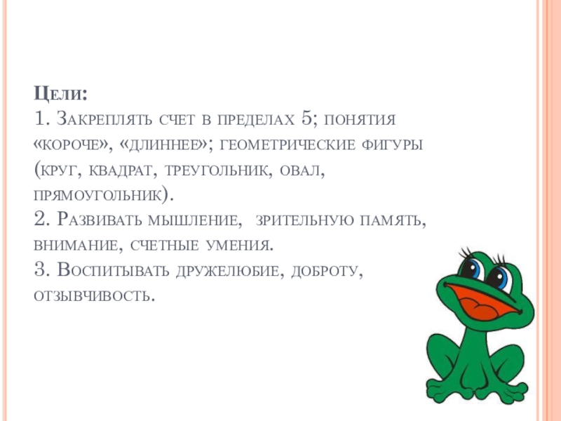 Слайд 2Цели: 1. Закреплять счет в пределах 5; понятия «короче», «длиннее»; геометрические