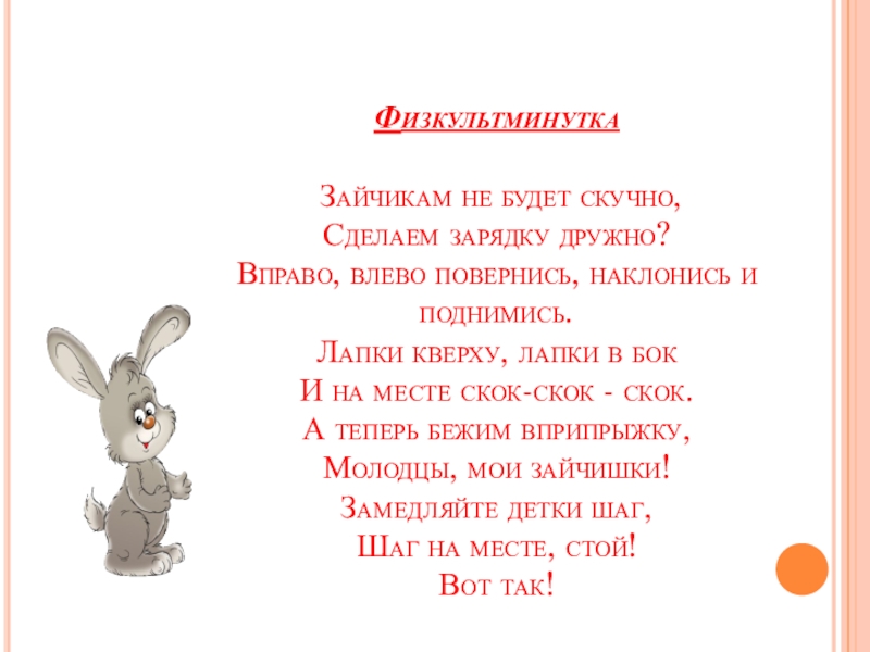 Слайд 13Физкультминутка Зайчикам не будет скучно, Сделаем зарядку дружно? Вправо, влево повернись, наклонись