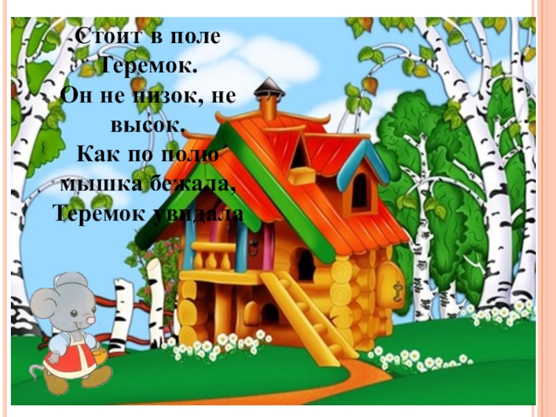 Слайд 3Стоит в поле Теремок. Он не низок, не высок. Как по полю мышка