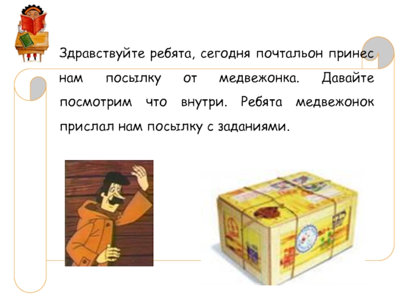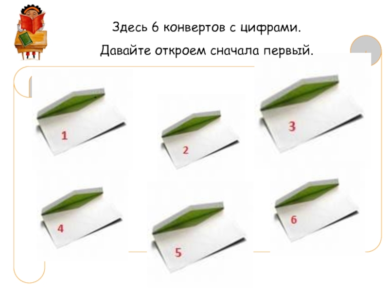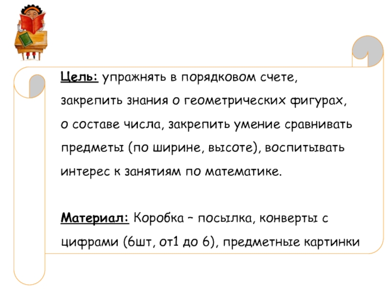Материал: Коробка – посылка, конверты с цифрами (6шт, от1 до 6), предметные картинки