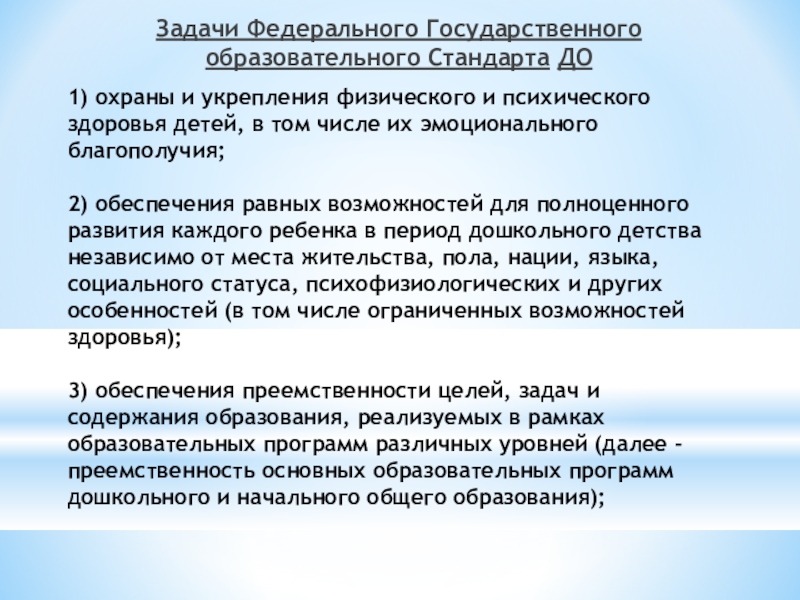 Задачи Федерального Государственного образовательного Стандарта ДО