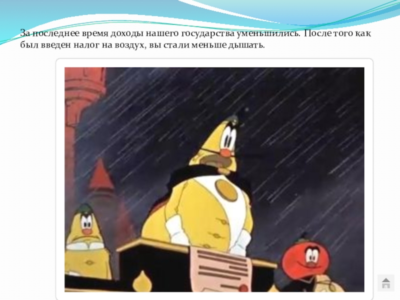 За последнее время доходы нашего государства уменьшились. После того как был введен налог на воздух, вы стали