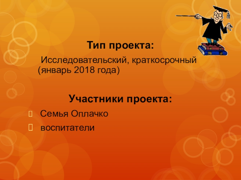 Тип проекта:	Исследовательский, краткосрочный (январь 2018 года)Участники проекта: Семья Оплачко воспитатели