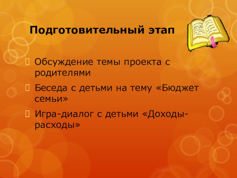 Подготовительный этапОбсуждение темы проекта с родителямиБеседа с детьми на тему «Бюджет семьи»Игра-диалог с детьми «Доходы-расходы»