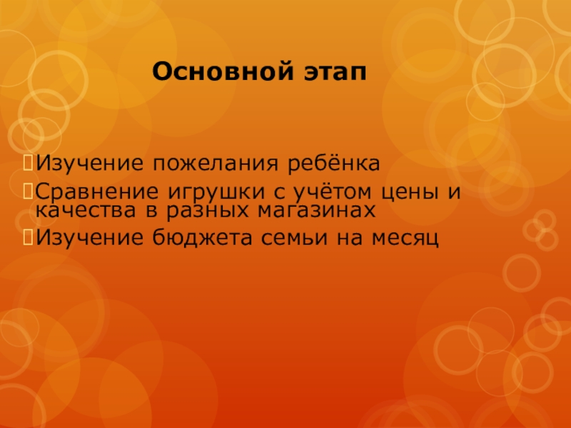 Основной этапИзучение пожелания ребёнкаСравнение игрушки с учётом цены и качества в разных магазинахИзучение бюджета семьи на месяц