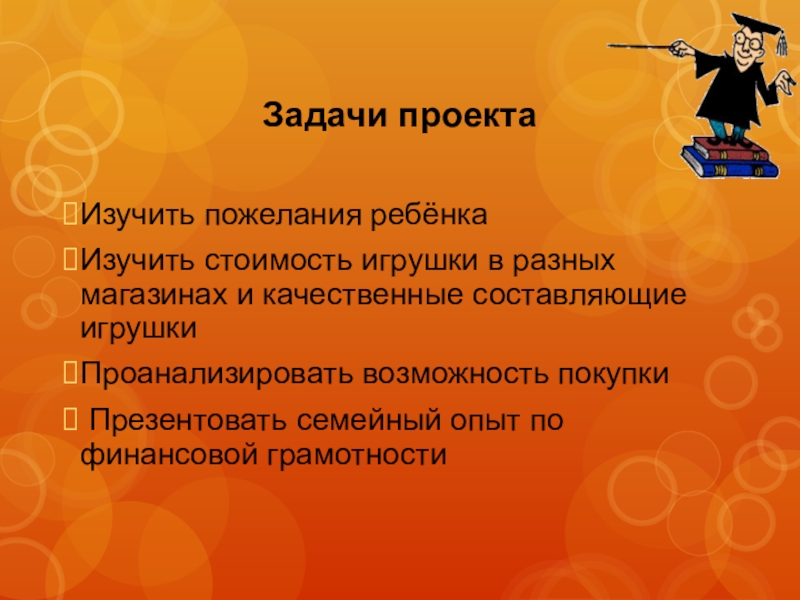 Задачи проектаИзучить пожелания ребёнкаИзучить стоимость игрушки в разных магазинах и качественные составляющие игрушкиПроанализировать возможность покупки Презентовать семейный