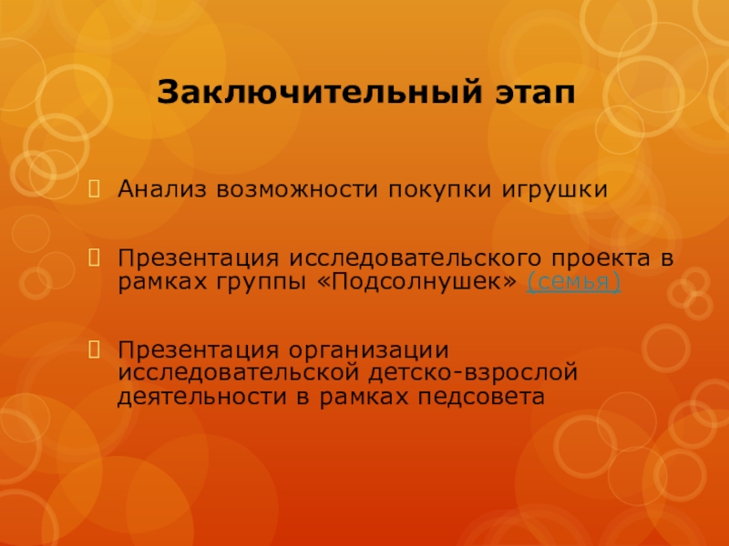 Заключительный этапАнализ возможности покупки игрушкиПрезентация исследовательского проекта в рамках группы «Подсолнушек» (семья)Презентация организации исследовательской детско-взрослой деятельности в