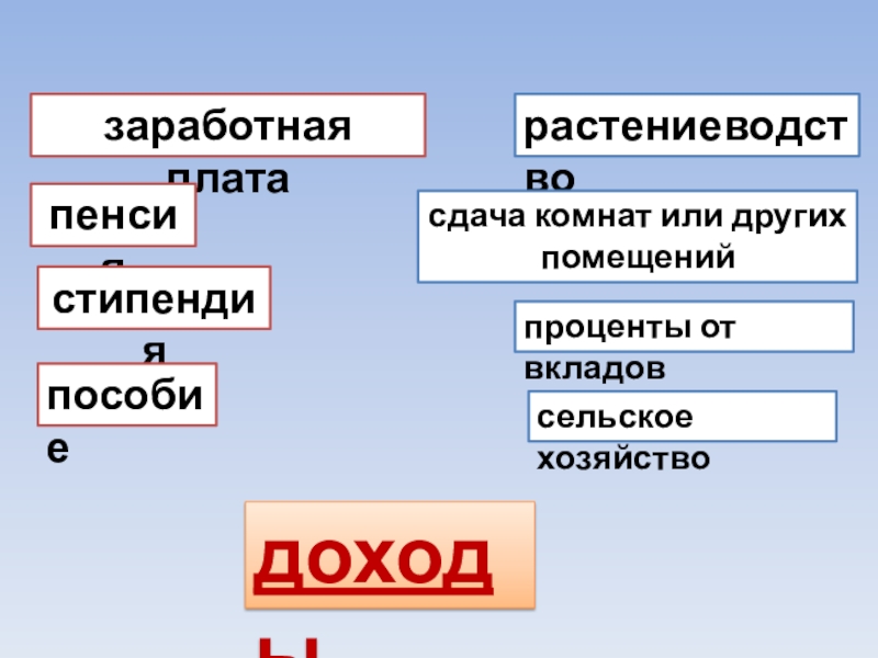 заработная плата пенсиястипендияпособиерастениеводствосдача комнат или других помещенийпроценты от вкладовсельское хозяйстводоходы