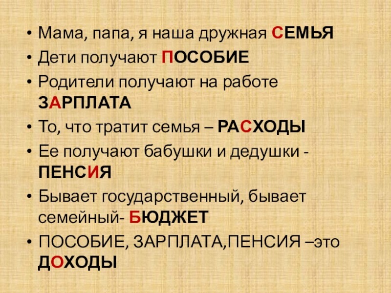 Мама, папа, я наша дружная СЕМЬЯДети получают ПОСОБИЕРодители получают на работе ЗАРПЛАТАТо, что тратит семья – РАСХОДЫЕе