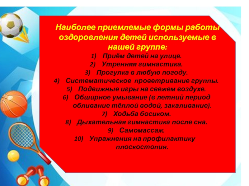 Слайд 14Наиболее приемлемые формы работы оздоровления детей используемые в нашей группе: