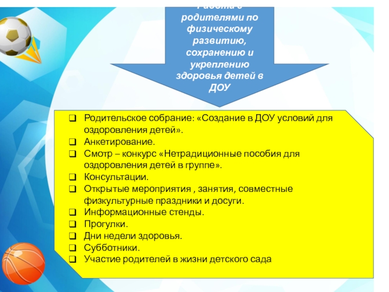 Слайд 27Работа с родителями по физическому развитию, сохранению и укреплению здоровья детей