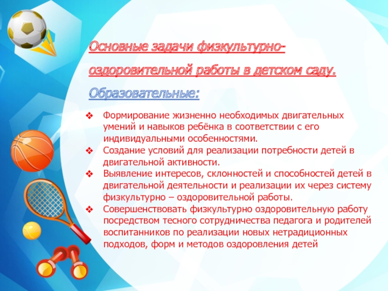 Слайд 5Основные задачи физкультурно-оздоровительной работы в детском саду.