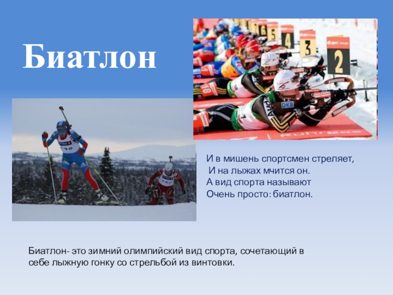 Биатлон- это зимний олимпийский вид спорта, сочетающий в себе лыжную гонку со стрельбой из винтовки.