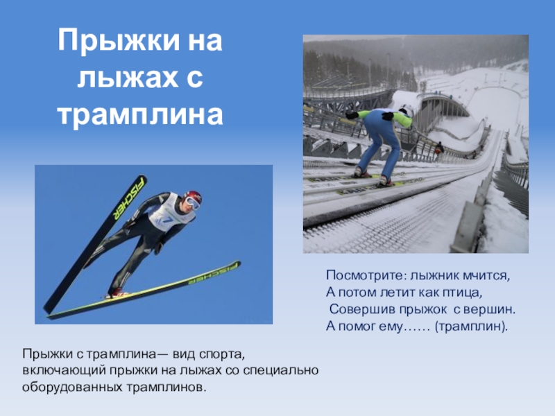 Прыжки с трамплина— вид спорта, включающий прыжки на лыжах со специально оборудованных трамплинов.