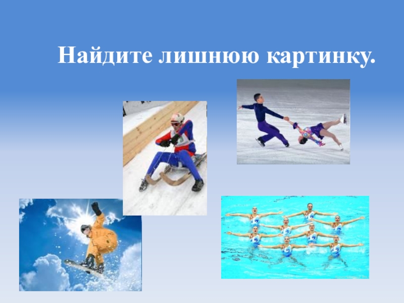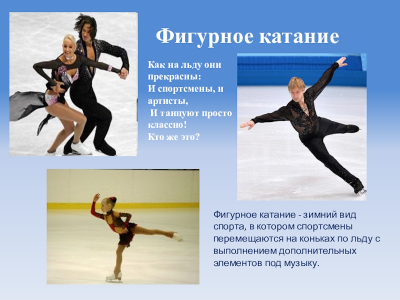 Фигурное катание - зимний вид спорта, в котором спортсмены перемещаются на коньках по льду с выполнением дополнительных элементов под музыку.