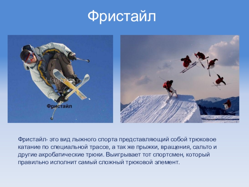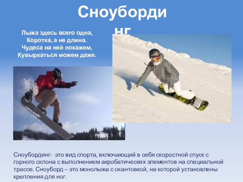 Сноубординг- это вид спорта, включающий в себя скоростной спуск с горного склона с выполнением акробатических элементов на специальной трассе. Сноуборд – это монолыжа с окантовкой, на которой установлены крепления для ног.