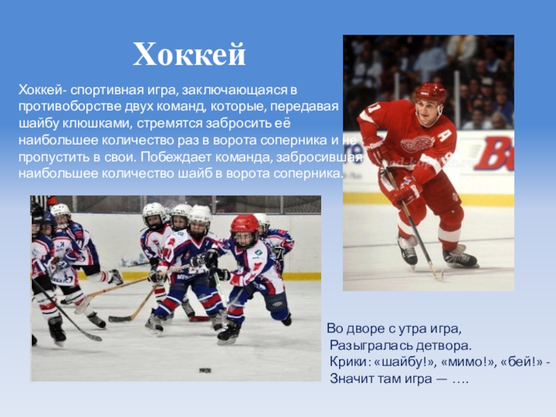 Хоккей- спортивная игра, заключающаяся в противоборстве двух команд, которые, передавая шайбу клюшками, стремятся забросить её наибольшее количество раз в ворота соперника и не пропустить в свои. Побеждает команда, забросившая наибольшее количество шайб в ворота соперника.