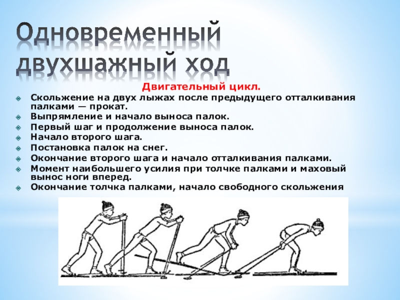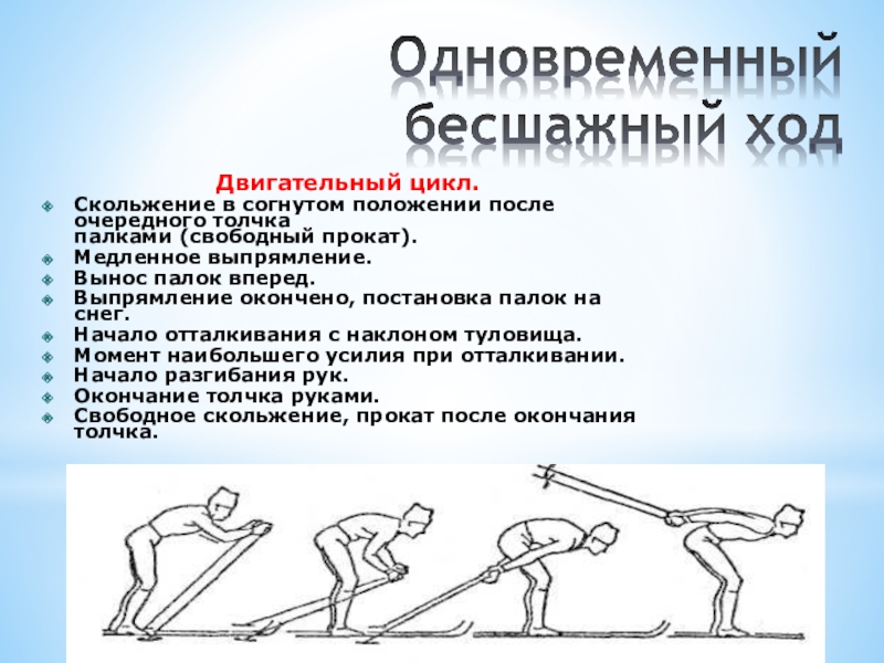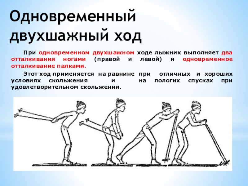 Этот ход применяется на равнине при отличных и хороших условиях скольжения и на пологих спусках при удовлетворительном скольжении.