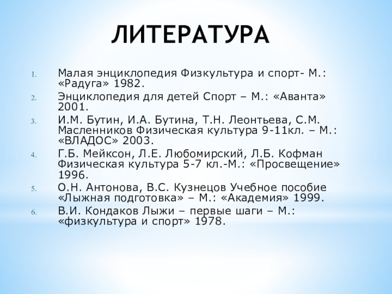 О.Н. Антонова, В.С. Кузнецов Учебное пособие «Лыжная подготовка» – М.: «Академия» 1999.