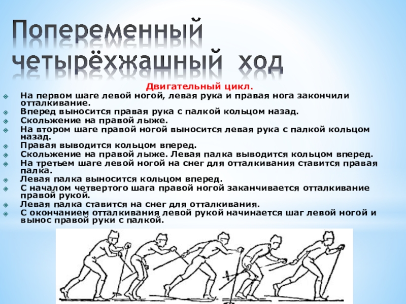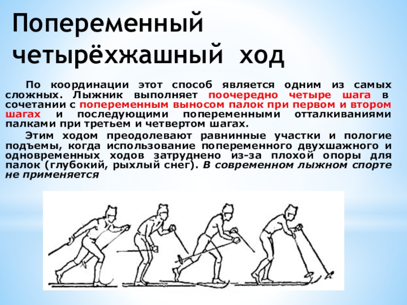 Лыжник выполняет поочередно четыре шага в сочетании с попеременным выносом палок при первом и втором шагах и последующими попеременными отталкиваниями палками при третьем и четвертом шагах.