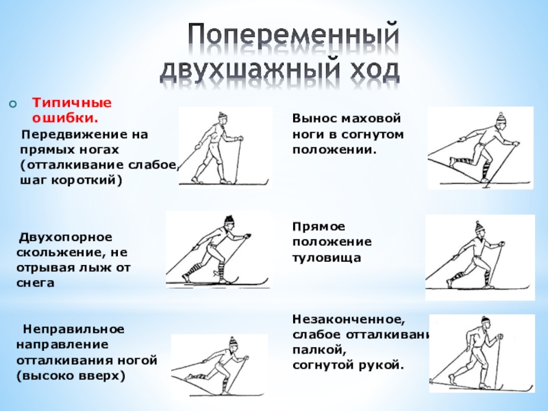 лыжах. Попеременным он называется потому, что происходит попеременная работа палками. Двухшажным - потому, что один цикл движений состоит из двух скользящих шагов (левой и правой ногой) и двух попеременных отталкиваний палками ( правой и левой рукой) – одно отталкивание палкой на каждый шаг.