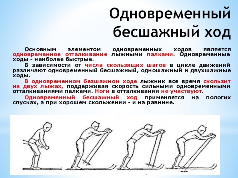 Одновременный бесшажный ход применяется на пологих спусках, а при хорошем скольжении - и на равнине.