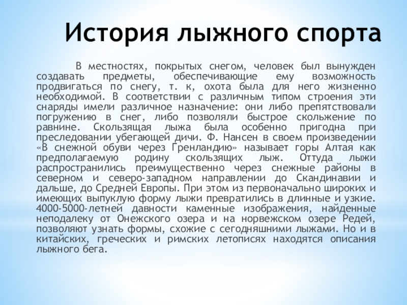 вынужден создавать предметы, обеспечивающие ему возможность продвигаться по снегу, т. к, охота была для него жизненно необходимой. В соответствии с различным типом строения эти снаряды имели различное назначение: они либо препятствовали погружению в снег, либо позволяли быстрое скольжение по равнине. Скользящая лыжа была особенно пригодна при преследовании убегающей дичи. Ф. Нансен в своем произведении «В снежной обуви через Гренландию» называет горы Алтая как предполагаемую родину скользящих лыж. Оттуда лыжи распространились преимущественно через снежные районы в северном и северо-западном направлении до Скандинавии и дальше, до Средней Европы. При этом из первоначально широких и имеющих выпуклую форму лыжи превратились в длинные и узкие. 4000-5000-летней давности каменные изображения, найденные неподалеку от Онежского озера и на норвежском озере Редей, позволяют узнать формы, схожие с сегодняшними лыжами. Но и в китайских, греческих и римских летописях находятся описания лыжного бега.