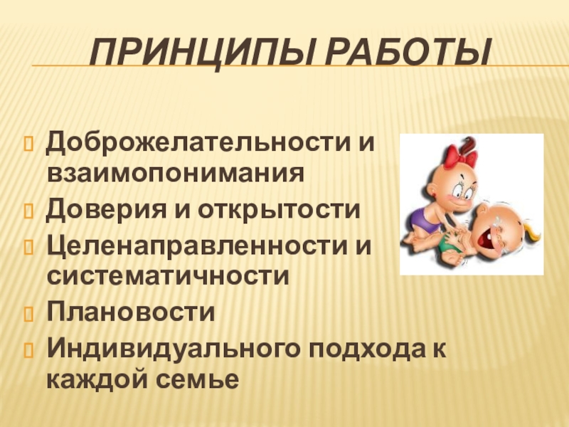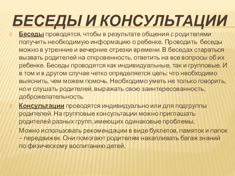 необходимую информацию о ребенке. Проводить беседы можно в утренние и вечерние отрезки времени. В беседах стараться вызвать родителей на откровенность, ответить на все вопросы об их ребенке. Беседы проводятся как индивидуальные, так и групповые. И в том и в другом случае четко определяется цель: что необходимо выяснить, чем можем помочь. Необходимо уметь не только говорить, но и слушать родителей, выражать свою заинтересованность, доброжелательность.