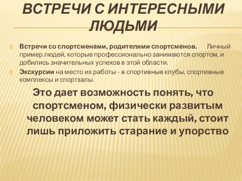 Личный пример людей, которые профессионально занимаются спортом, и добились значительных успехов в этой области.