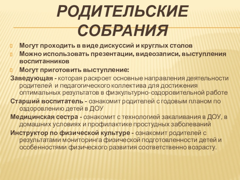 Старший воспитатель - ознакомит родителей с годовым планом по оздоровлению детей в ДОУ