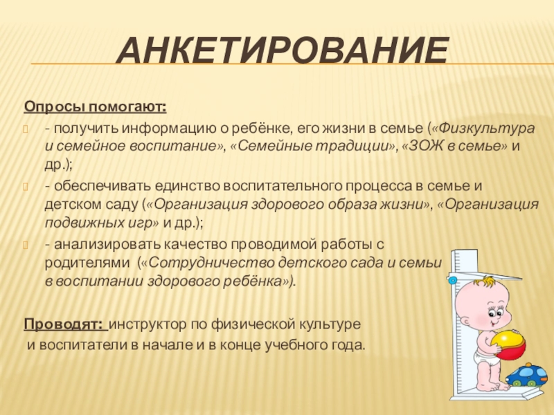 - анализировать качество проводимой работы с родителями («Сотрудничество детского сада и семьи в воспитании здорового ребёнка»).