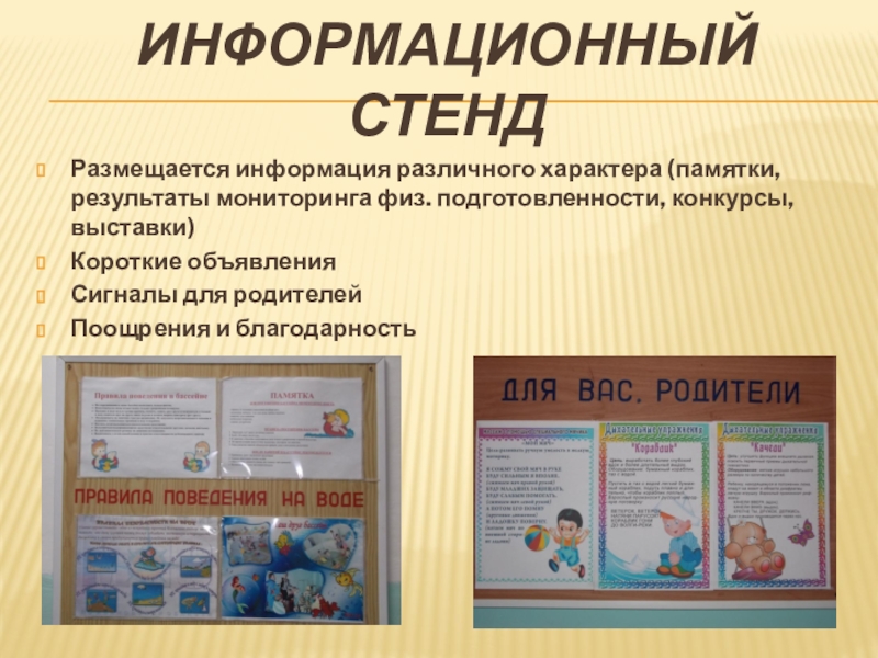 Размещается информация различного характера (памятки, результаты мониторинга физ. подготовленности, конкурсы,
