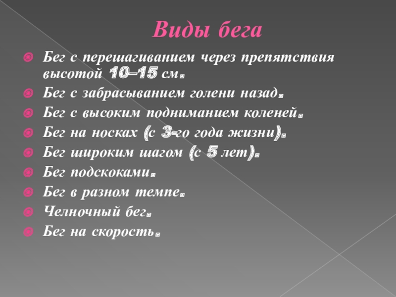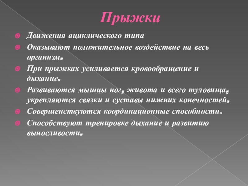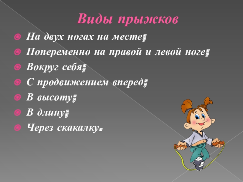 (подпрыгиваний, спрыгивания с небольшого возвышения). Постепенно переходят к более сложным прыжкам (в длину и в высоту с места, а затем и с разбега).