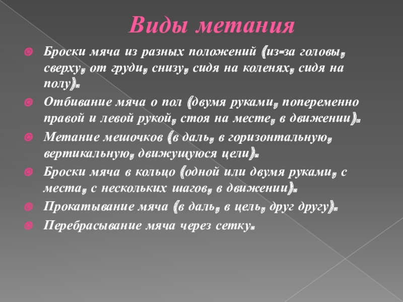 Обучению метанию лучше начать с упражнений с мячами: катание, бросание,